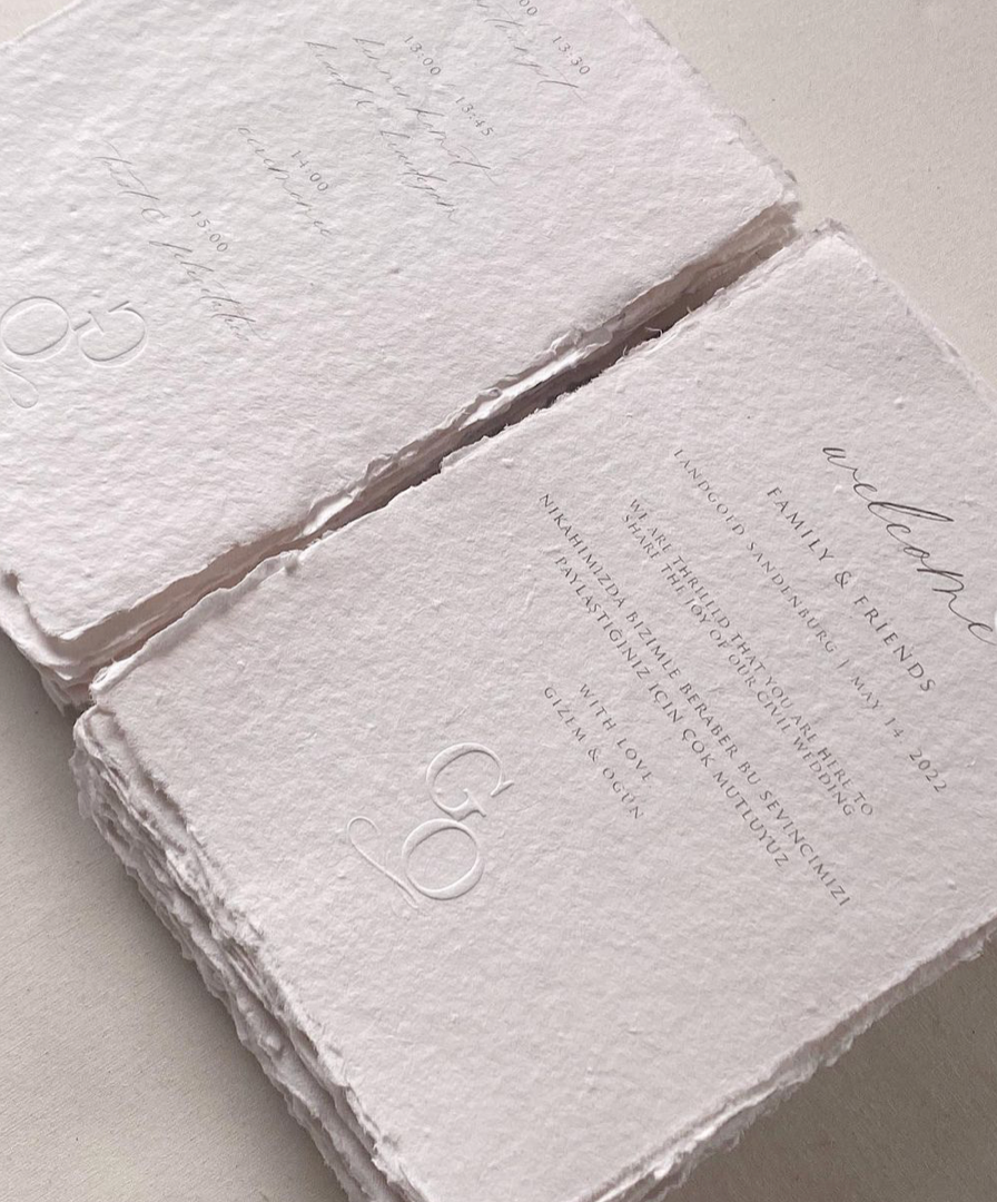 The characteristics of handmade paper are the feathery edges and the semi-matte finish with a fine rib. The main advantage of handmade paper is that it is 100 percent recycled and wood-free. In addition, our handmade paper consists of 100 percent cotton, ensuring we can offer better quality for our customers. It is a sublime detail for special occasions and adds to the value of the experience.